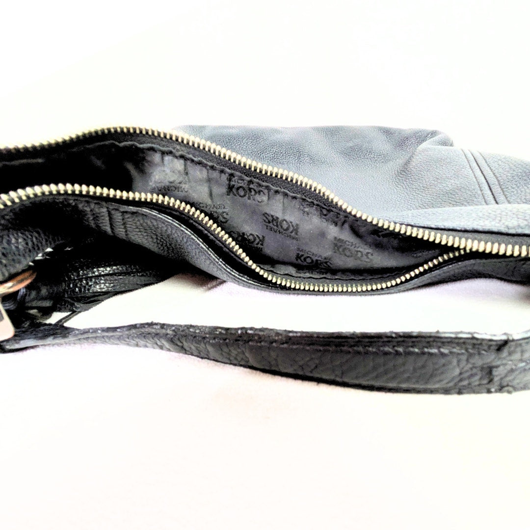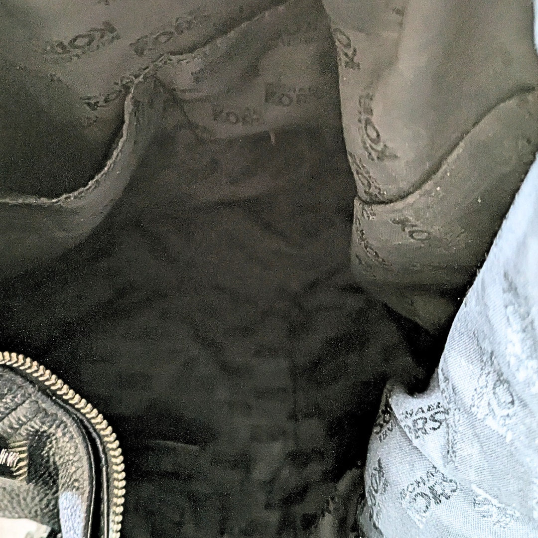 - Interior: Black MK logo lining with zip and slide pockets, embossed leather logo patch